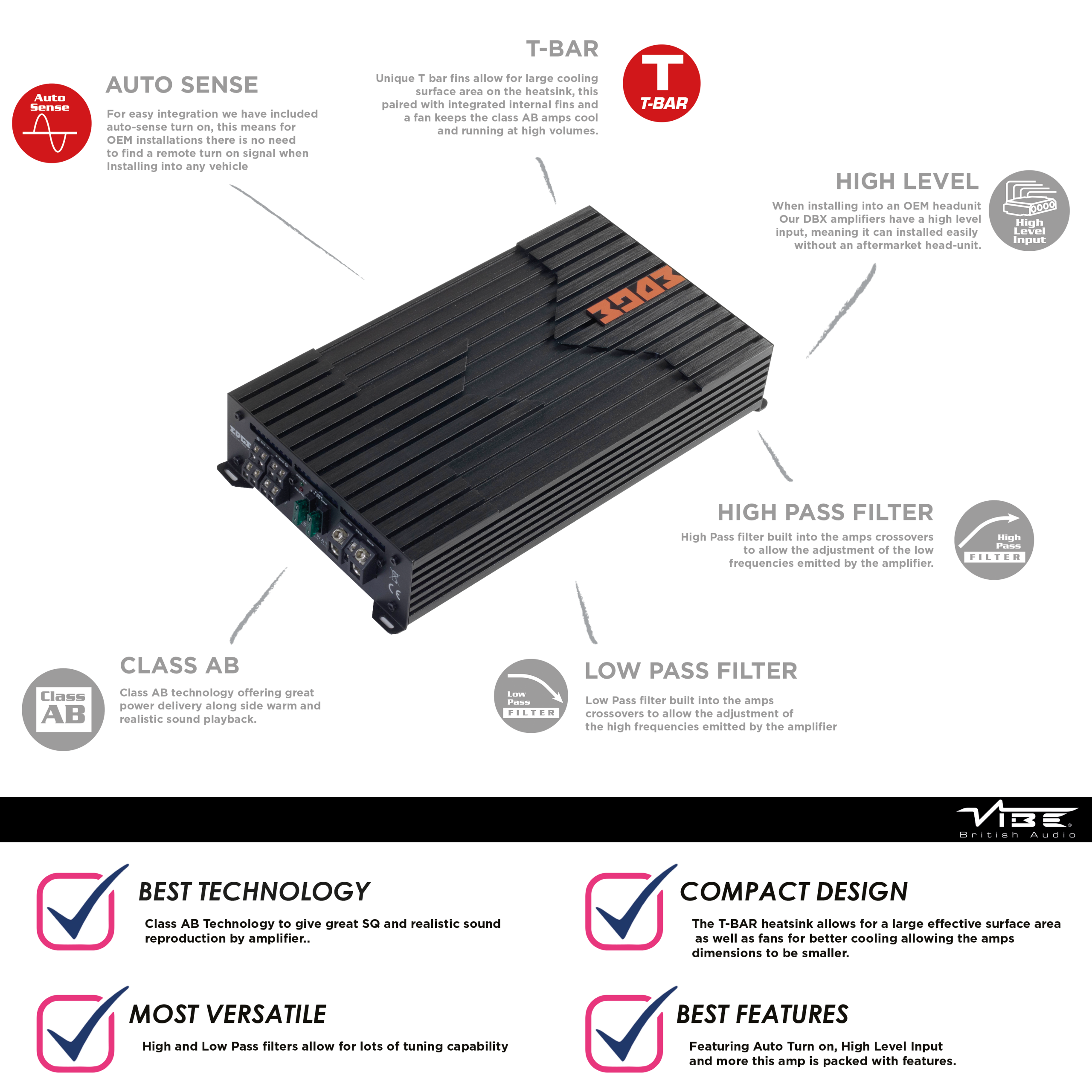The DBX Series amplifiers have some fantastic new unique features, The New EDGE heat- sink has progressive T bar fins promoting heat dispersion to keep the amps cool. The 2 and 4 channel class AB models feature an extended set of filters with the HPF up to 11Khz and the LPF to 4Khz giving much more control of your speakers than the average amplifier