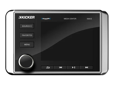 Tons more fun for your cruise! KICKER’s premier KMC5 Media Center features six channels of built-in power, delivering up to 240 watts to your speakers! Equipped with an AM/FM/satellite/weather-band tuner, charging USB connection and four sets of RCA outputs for easy expansion. Includes RGB LED trim ring, and chrome and black trim bezels.